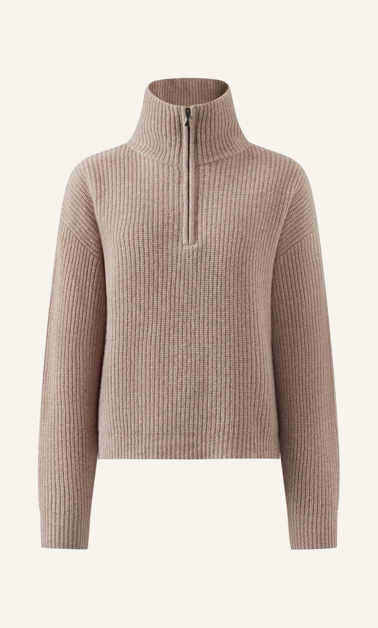Her refined mock neck, finished with a subtle wavy edge, cradles the neckline with enduring elegance, while the shoulder-button detailing adds an artful touch that feels both modern and timeless.