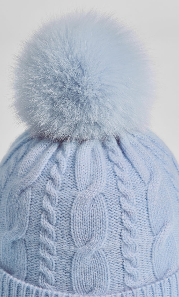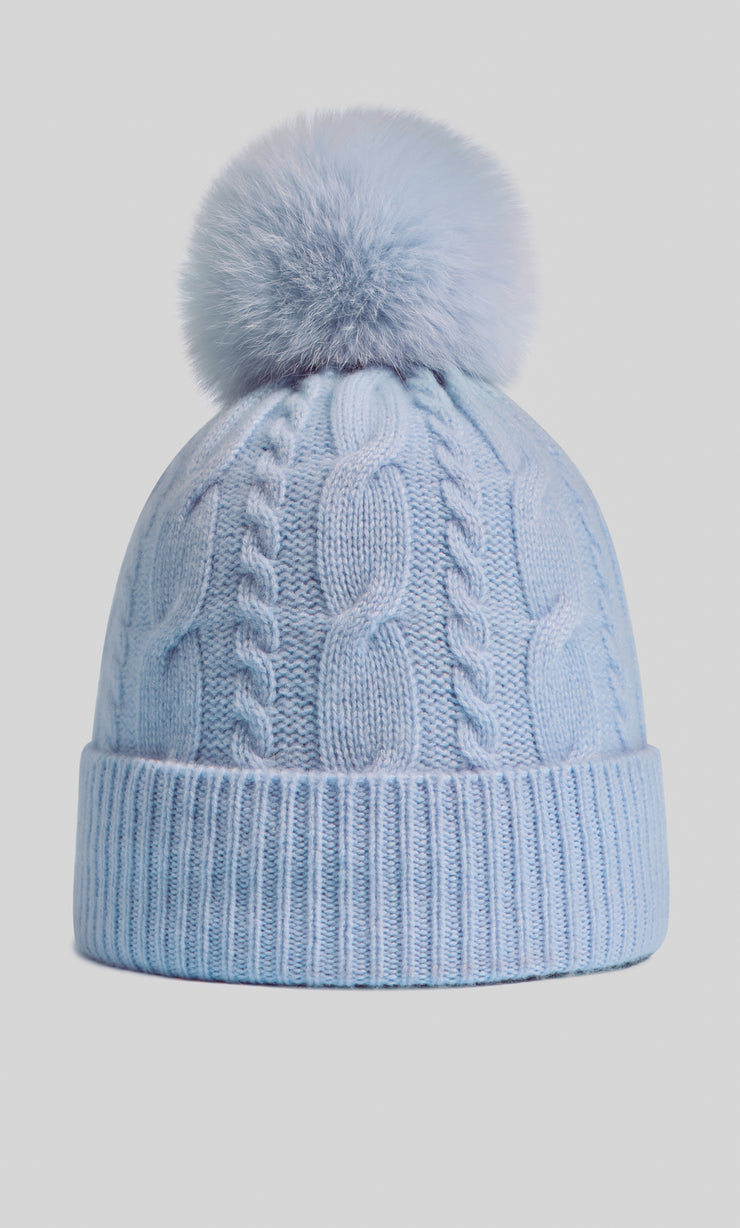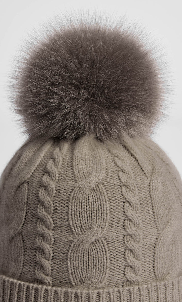 Indulge yourself in supreme warmth with the iconic Cable-Knit Cashmere Beanie, featuring a classic interlocking cable-knit pattern accentuated with a plush fox fur pom-pom.